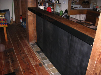 The aluminum painted with that POR-15 engine enamel. Looks like patent leather shoes. The bar itself was contributed by my neighbor. It's a 1" thick slab of walnut!!!