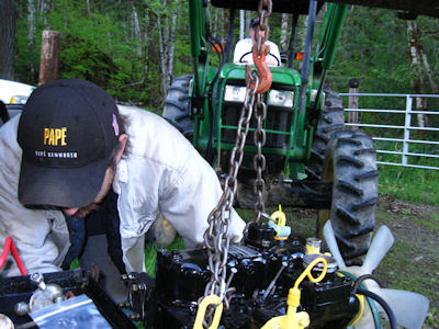 Chris positions the motor over the mounts as another neighbor, Mark, awaits the signal to lower it in.